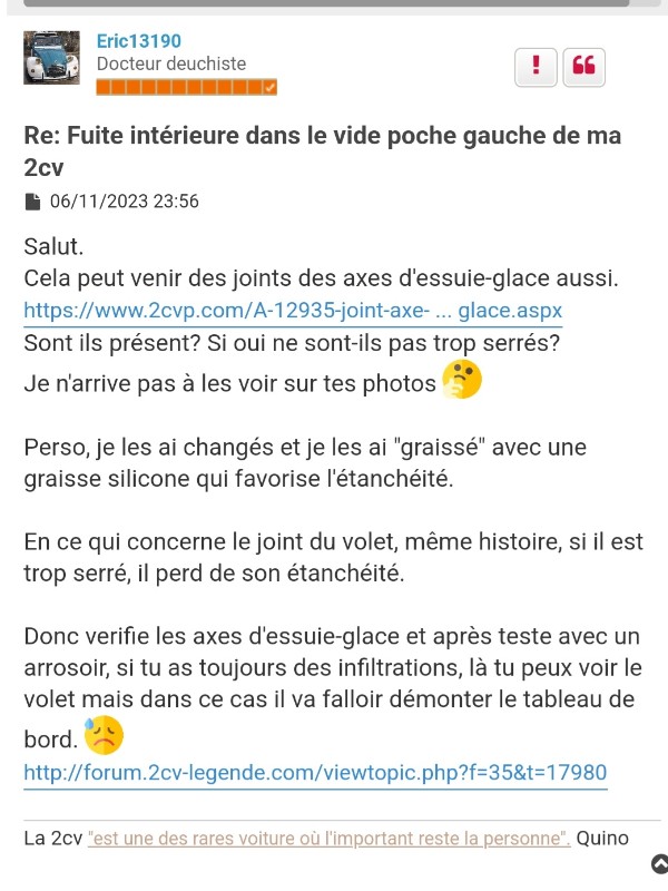 Alors vu le temps en ce moment qui est pluvieux et très humide, et comme que lorsque qu'il pleut ma deuche a tendance à prendre l'eau en roulant du coté du tableau de bord ce qui me mouille sur les jambes, j'ai décidé d'aller voir du coté des essuies glaces