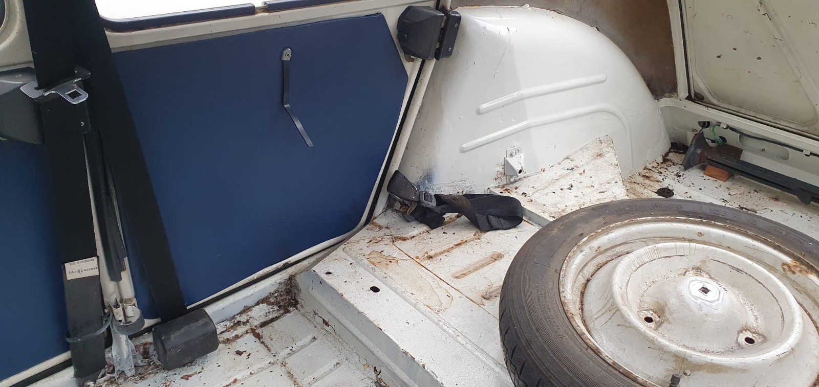 Le plancher de coffre avait été refait 'partiellement' pour eviter un classement épave suite à un léger choc AR... on voit la tôle 'lisse' sous le cric. Du coup, le panneau AR et les queues de pies sont en état (c'est déjà ça) :