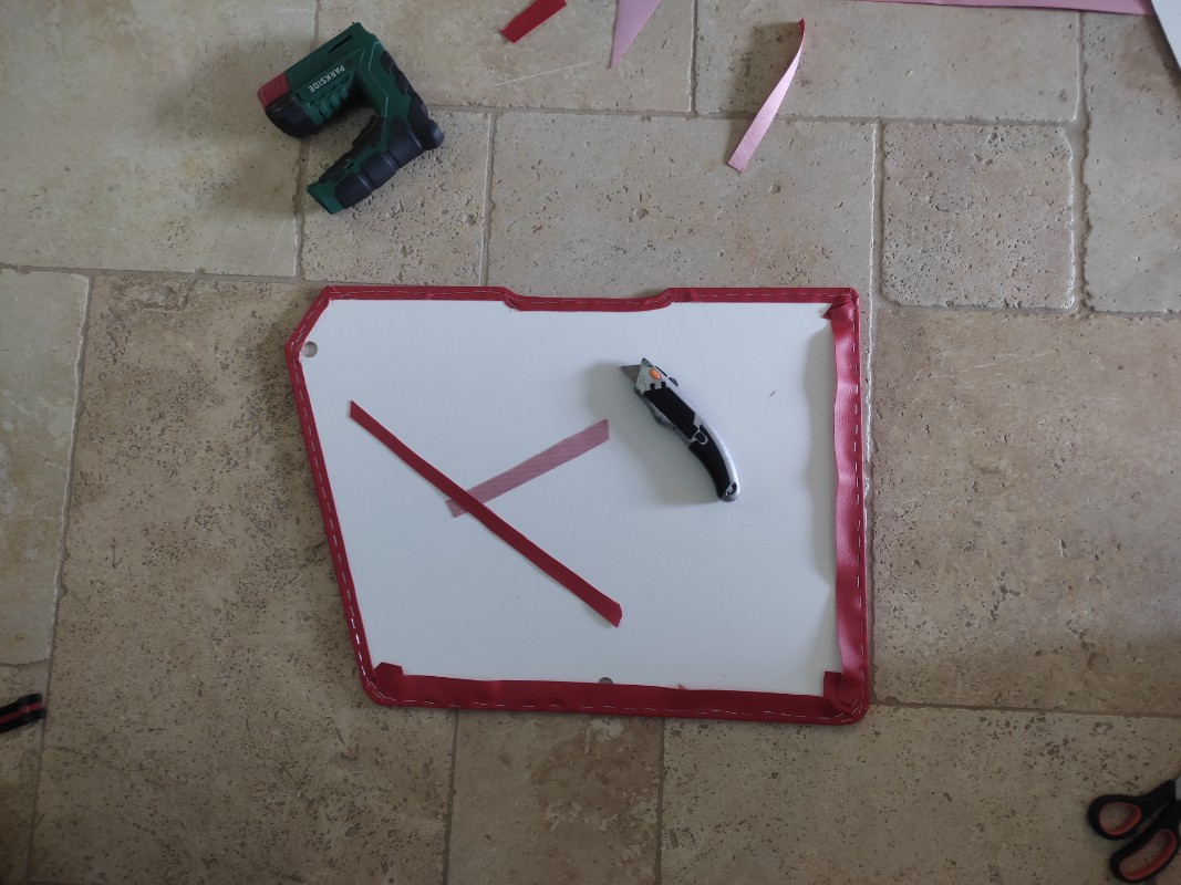 Pour la mousse j'ai mis du ciel de toit entoilé trouvé en magasin de tissu ou chez Mondial, je l'ai découpé aux dimensions du panneau, je le préfère à la mousse simple qui bouge davantage.
