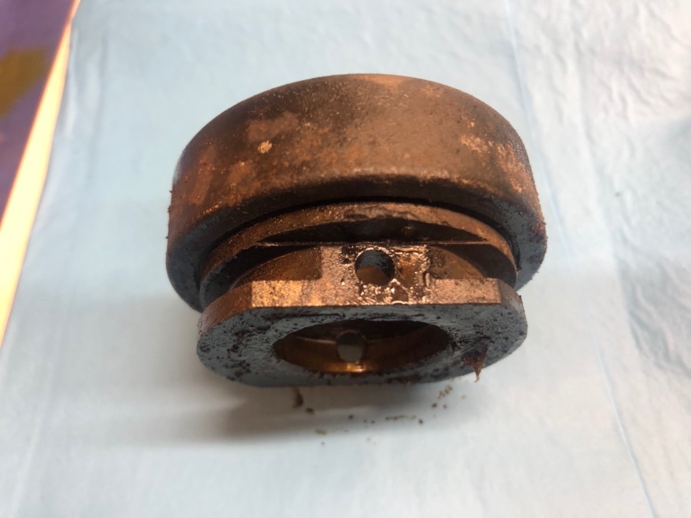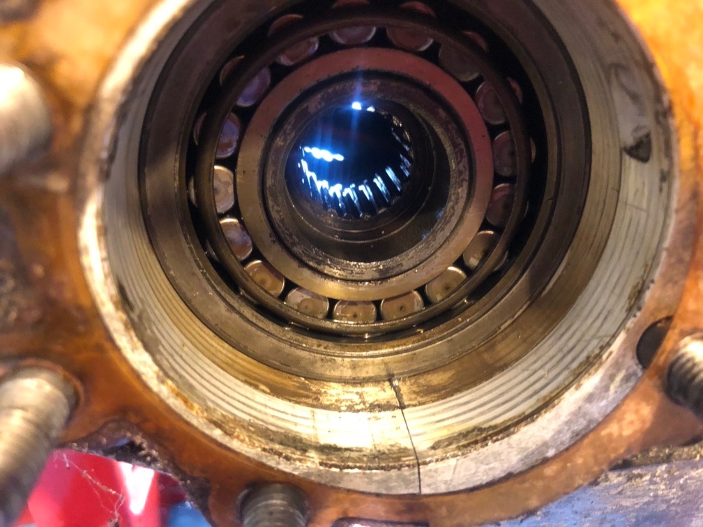 Et voilà ce qui "reste" coté carter de BV : à droite, l'arbre de commande et à gauche le pignon conique, avec sa denture hélicoïdale.