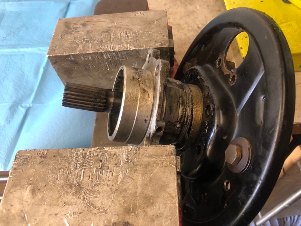 En haut, le flasque de frein (absent sur une BV à disque), l'arbre de sortie