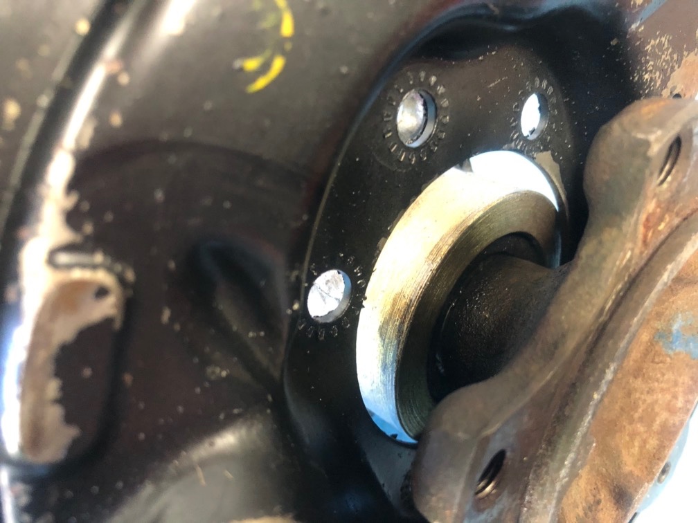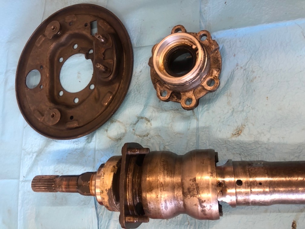 En haut, le flasque de frein (absent sur une BV à disque), l'arbre de sortie