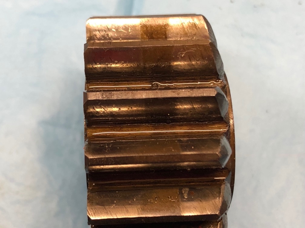 Dans notre BV que nous démontons, le pignon de MA présente des bandes de contact mais tourne sans jeu, sans bruit et les entrées de dent sont correctes. Je ne vais donc pas le retirer.
