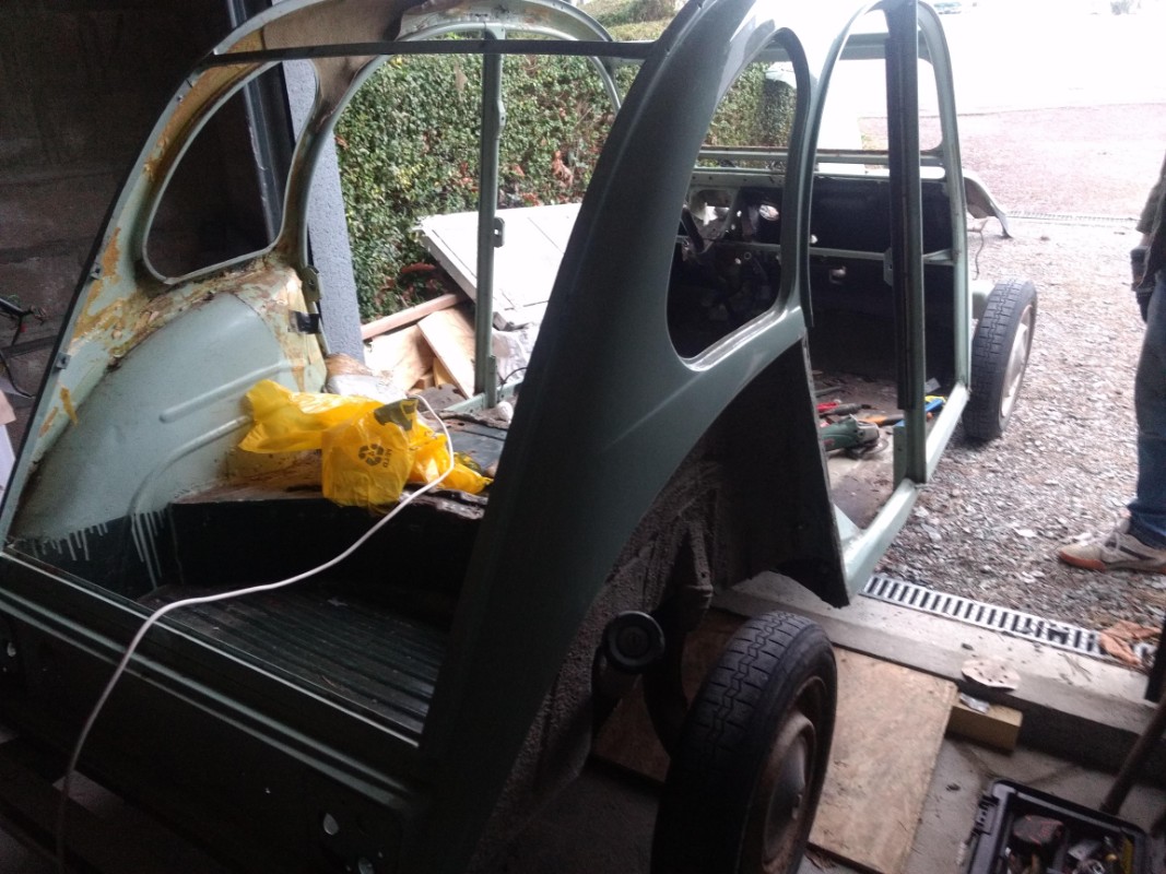 Le démontage d'une 2cv est vraiment rapide. Tous les panneaux de carrosserie sont retirés, les faisceaux électriques, le tableau de bord également.