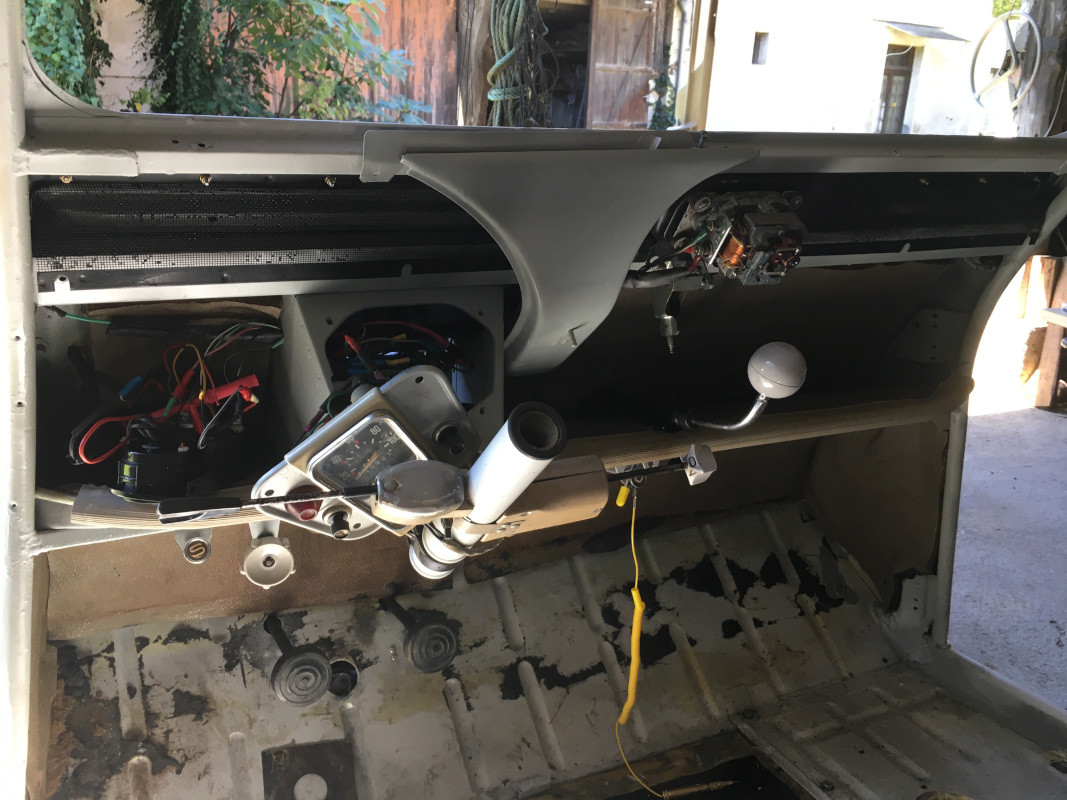 Une fois remonté, tout va beaucoup mieux, même si, maintenant, il ne s'arrête qu'une fois sur deux (ou trois)... Il faut que je revoie le principe du retour en position basse, sans doute lié au basculement d'un frein sur le rotor Un peu de graisse marine autour des paliers, avec des joints neufs, assureront, espérons-le, l'étanchéité de l'ensemble... J'ai ensuite lavé le volant et la planche de bord, qui est plus ou moins bien revenue : J'ai en stock depuis des décennies, un petit bidon de "POLYTROL", je tenterai d'en passer pour voir si le plastique "revient" mieux, qu'à l'eau et au savon !