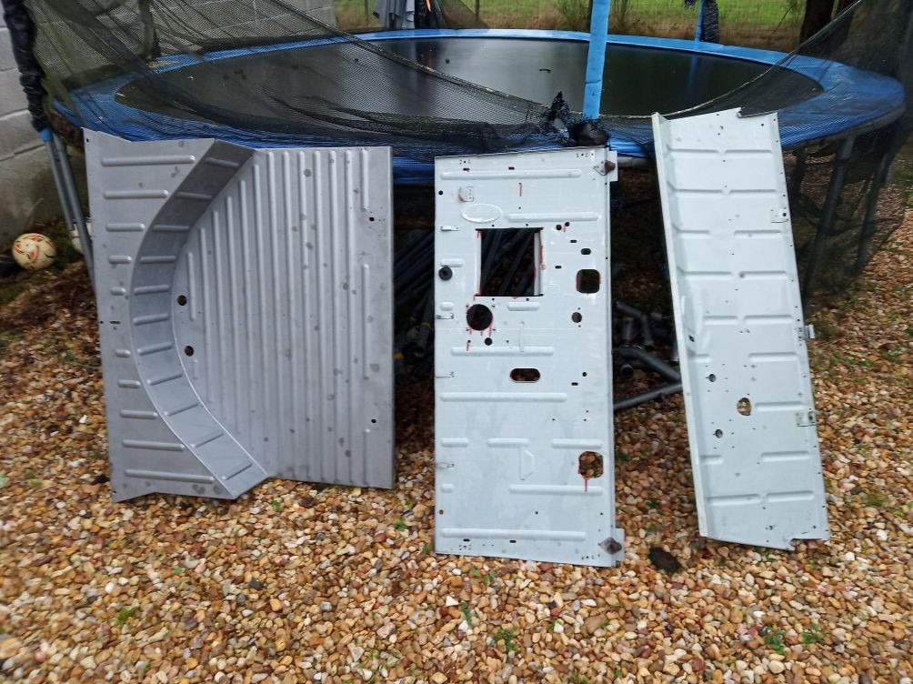 Le fond de coffre est tombé par terre car un tréteau déglingué a basculé, heureusement il est tombé en douceur à plat du bon côté ( comme les chats ).