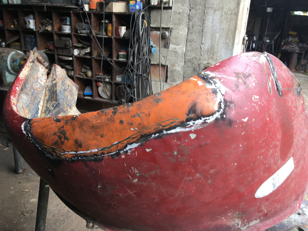 Je me suis attaqué d'abord au nettoyage, au ponçage et à la peinture des charnières de portes avant et de leur accastillage. Ensuite, j'ai commencé la réparation d'une des deux ailes arrière, la droite assez abîmée, mais largement sauvable.