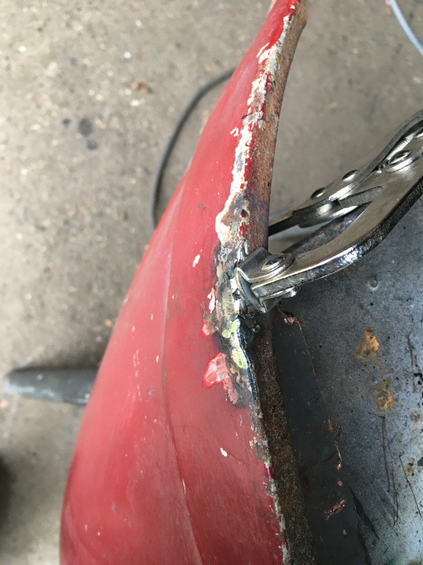Une couche d'antigravillons avait été passée, et comme de bien entendu, la rouille a fait son travail en arrière-plan : Plusieurs fentes sont bien sûr à réparer : Une petite tôle de renfort, serrée avec deux pinces Une plaque en cuivre pincée en dessous permet de réduire les échauffements, donc les trous.. Une fois la soudure réalisée : En bas de l'aile, autre fente, donc autre tôle et nouvelle soudure : Voilà, il n'y a plus qu'à poncer on avance !