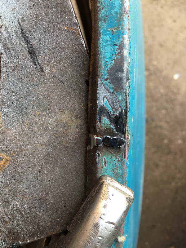 Je positionne un bout de cuivre assez épais sous la tôle à souder (cette méthode permet de faire baisser la température, et ainsi, évite, autant que possible, de percer les tôles fines !)