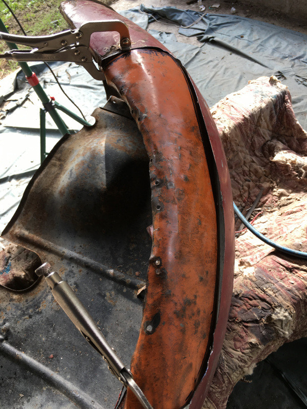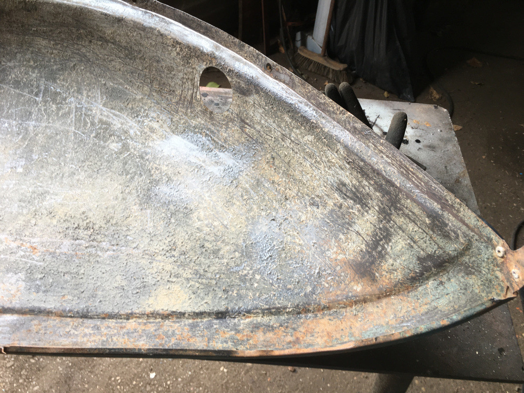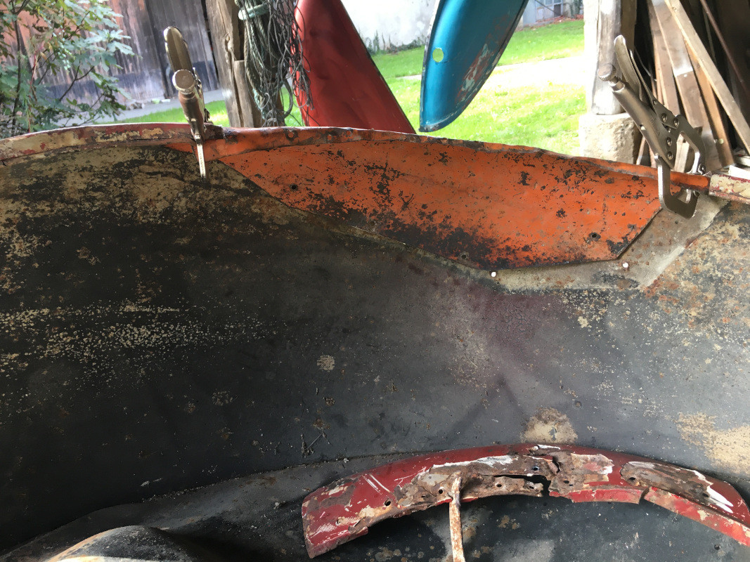 Ce matin, après avoir mis en place le silencieux sur la 15, et dans l'attente de recevoir la commandes des coupelles des cylindres de freins arrière, je me suis attaqué à la réparation de la partie la plus "gangrenée" de l'aile avant gauche..