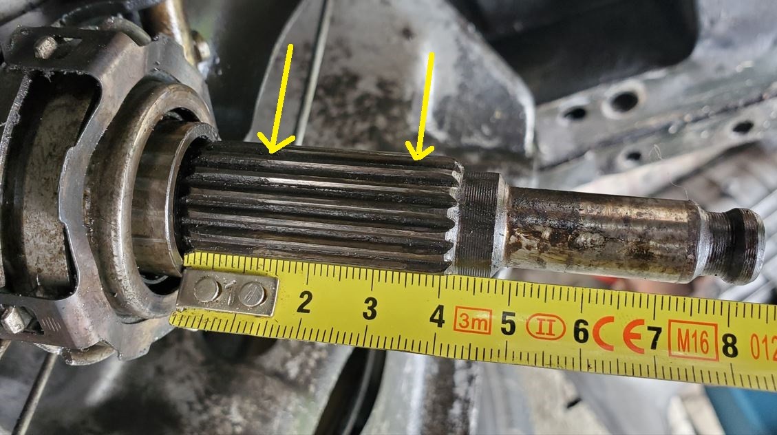 Avant ça j'ai constaté les marques du disque d’embrayage sur mon arbre d’origine à cannelures longues (flèches jaunes). En mesurant les marques et en projetant sur l’arbre de la Dyane, la longueur d’appui de l’embrayage sur les cannelures de l’arbre passe de 23mm à 10mm.