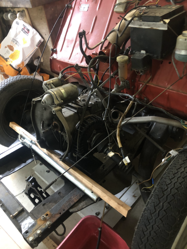 - avec un cric hydraulique on soulève légèrement ( env 4cm ) la boîte pour dégager le moteur du longeron avant du châssis...