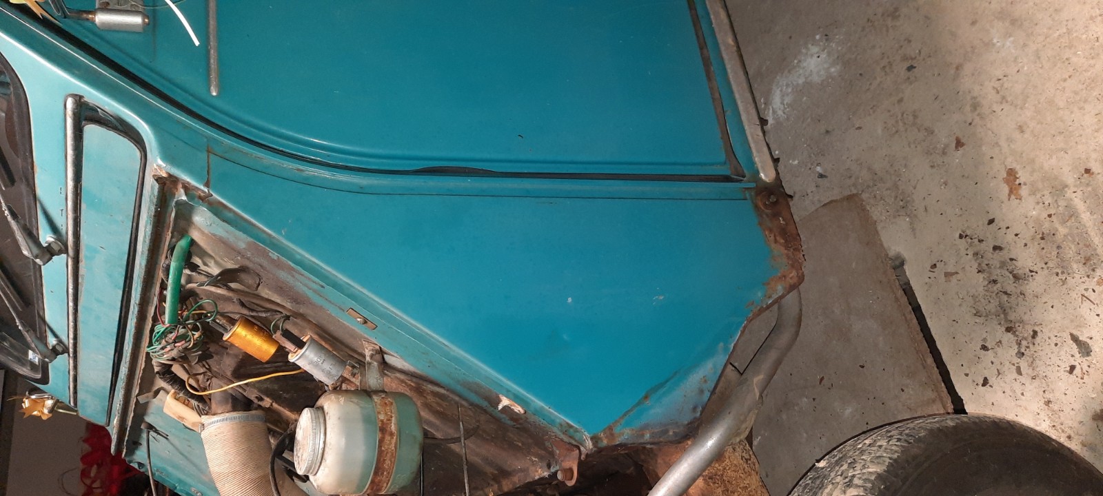 Elle est 'pas si pourrie' par rapport à ce qu j'ai déjà vu passer... Le chassis est bien attaqué.... tout est sauvable, c'est une question de moyen et / volonté, parfois ça tient plus de la reconstruction :) . Trop cool d'avoi rle beau père à 300m, avec un peu de capacité de stockage (en plus de l'expérience), car une deuche, c'ets pas si petit, mais une fois démonté, ça prend un max de place :surpris: