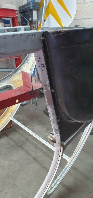 Devant, le pieds A a été également 'rabouté' et le profil de gouttière changé par une version conforme (pas si facile à trouver : bonne largeur d'appuis sur caisse et bonne profondeur) : reste à le tronconner à la forme du bas de caisse :