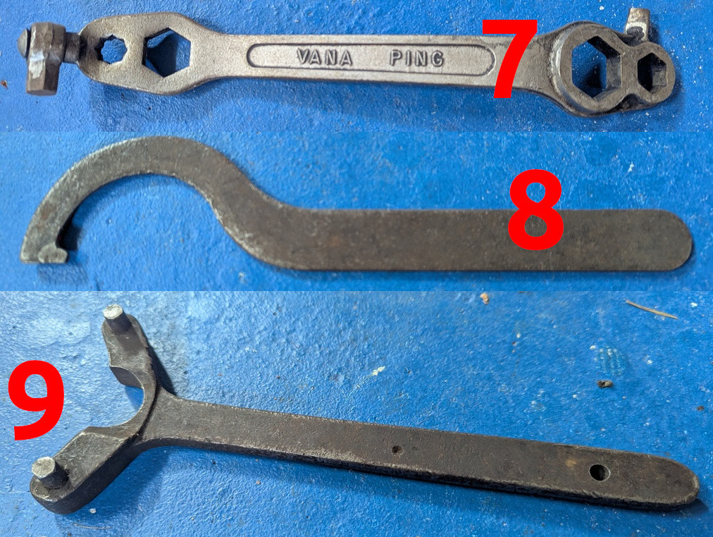 10 = ? poignée + tube courbé creux avec une ficelle qui passe à travers ; en haut le même outil neuf non déballé