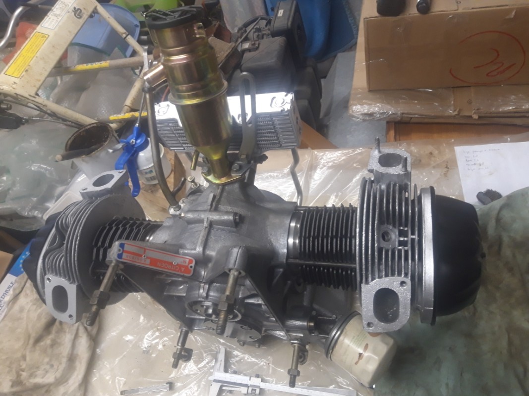 montage des chemises et des pistons, reniflard neuf, caches culbuteurs repeints, jauge à huile, présentation des culasses refaites à neuf,