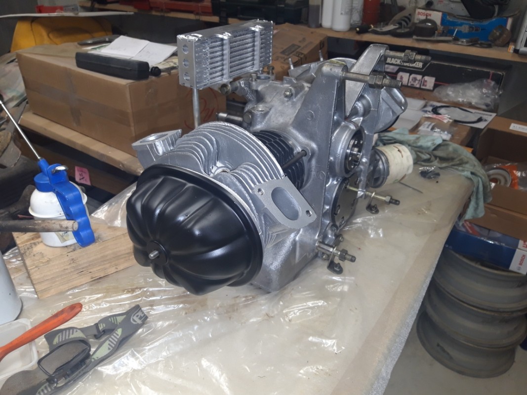 montage des chemises et des pistons, reniflard neuf, caches culbuteurs repeints, jauge à huile, présentation des culasses refaites à neuf,