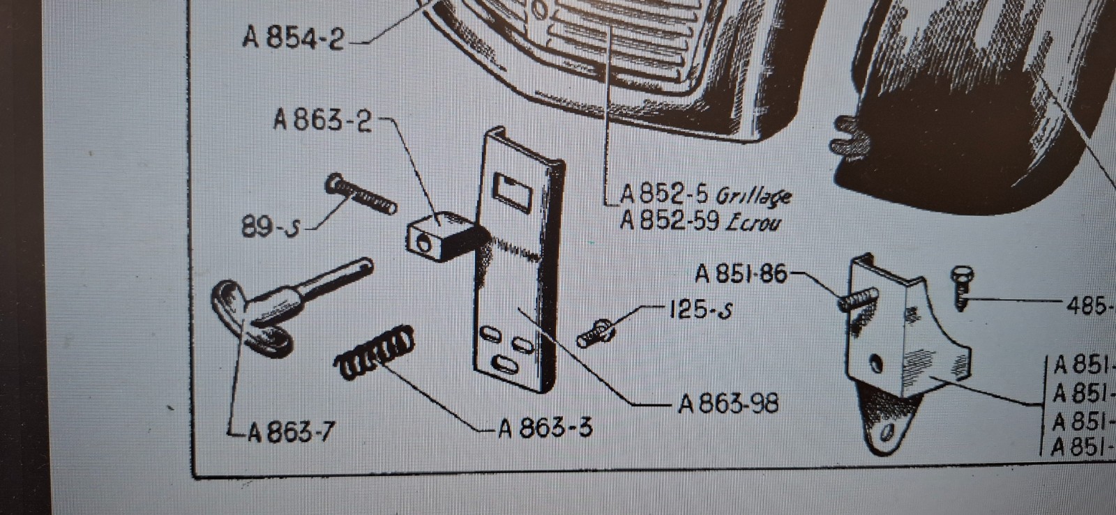 Pour ce qui est du verrou de capot, c'est la pièce A863-98 (gâche de capot)... assez simple à reproduire.... il faudrait juste des cotes ... ou je ferai des prises de mesure plus tard...