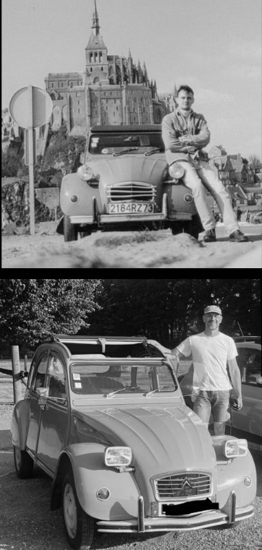 J'ai commencé ma vie d'automobiliste avec une Diane6, puis une 2CV6 (photo devant le mont St Michel), le tout pendant une dizaine d'années. Puis j'ai acheté une ''vraie'' voiture. Puis 2, puis 3... Et dernièrement j'ai rechuté, j'ai dégoté, acheté et renové une magnifique 2CV4 de 1977 qui était, je dois bien l'avouer, très bien conservée !