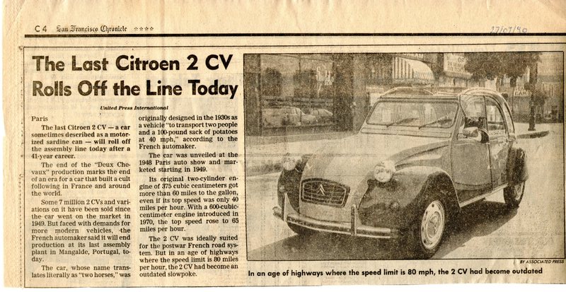 Il s'agit d'un article de presse du journal "San Francisco Chronilcle" daté du 27 juillet 1990, et qui relate la fin de la production de la 2CV.