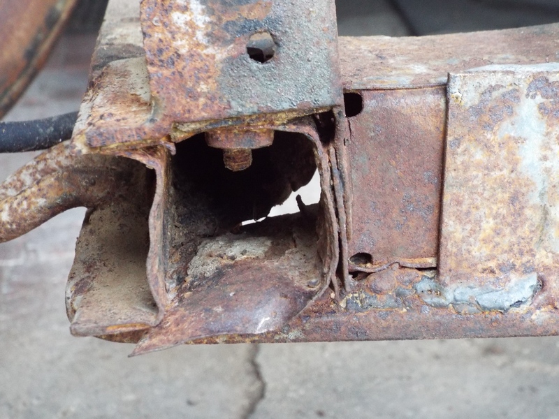 1 - le châssis a eu surement un gros choc à l'avant doit et a été réparé en soudant une grosse tôle en L qui fait la jonction entre le longeron et la traverse avant. C'est pas très beau au point de vue esthétique, mais ça a l'ai solide.