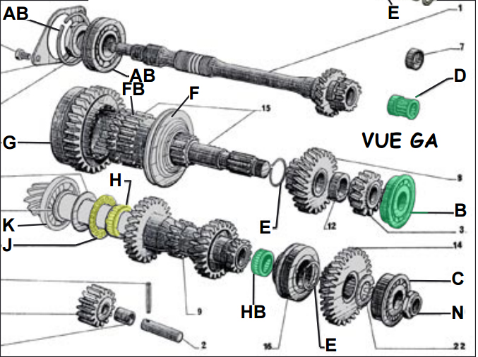 cette a dire les roulement AB , les pièces en jaune J-H? segment de ralentie E est le roulement épaulé C et K? puis refait le reglage du couple conique,