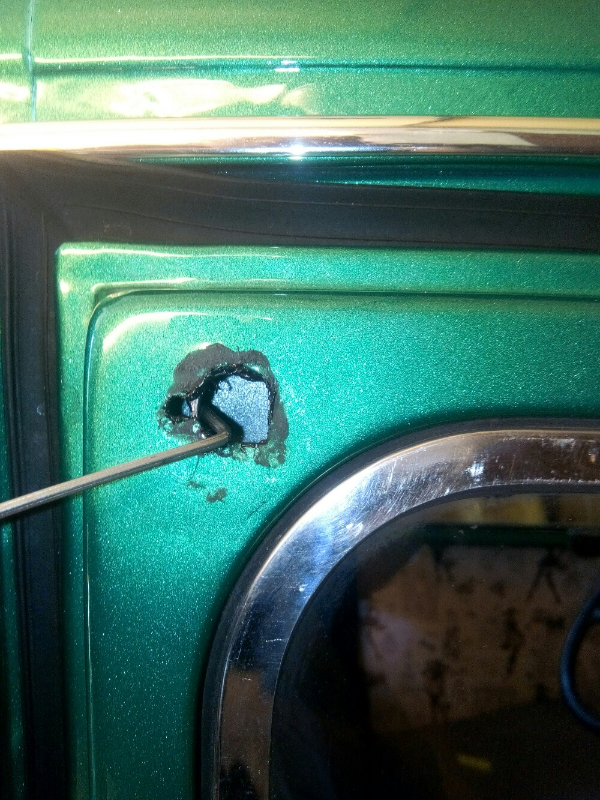 Perso, j'aurais reconstitué complétement la tôle d'origine : découpe de la partie endommagée, découpe d'une pièce de tôle de la même forme que la découpe faite dans la porte, perçage aux bonnes cotes, soudage au mig, meulage, ponçage, apprêt, etc. et re-peinture du haut de la porte jusqu'à la ceinture de caisse.