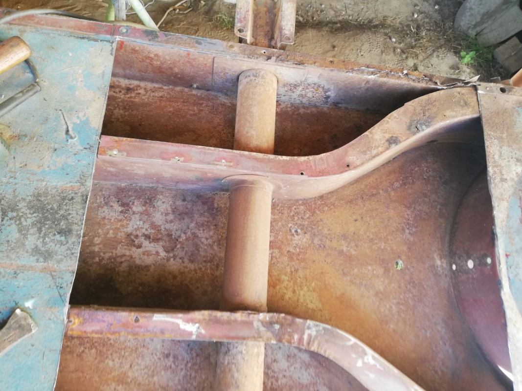 Mon diagnostic se confirme. Après avoir retirer la tôle du dessus j'ai trouvé trois kilos de terre + nid de souris : Mais la structure est relativement saine, je n'ai qu'un trou sur la dessus : et un trou dans le bas : Voilà ce n'est pas grand chose, le reste est rouillé mais légèrement en surface : donc je garde ce châssis ( important si je décide un jour de passer en carte grise de collection)...
