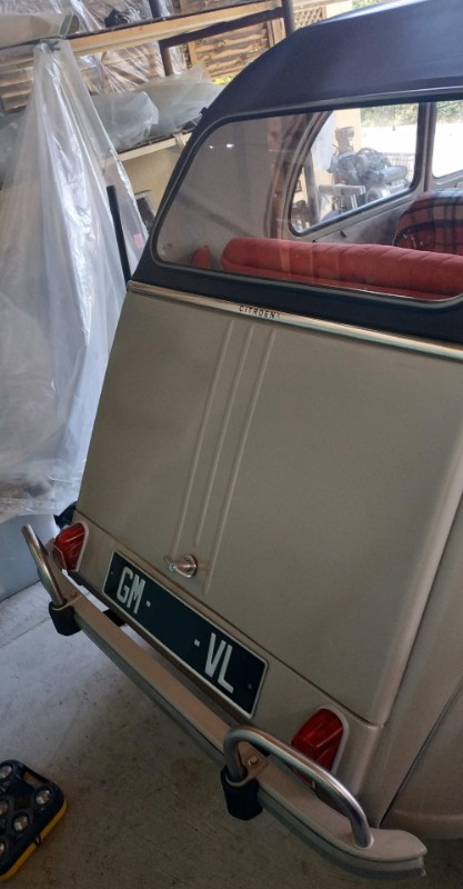 Aujourd'hui, on a mis les banquettes, la capote, la malle arrières, les pare soleil et j'ai installé dans la malle la roue de secours + le cric + la manivelle + la cale en bois + le cache calandre quand il fait froid.
