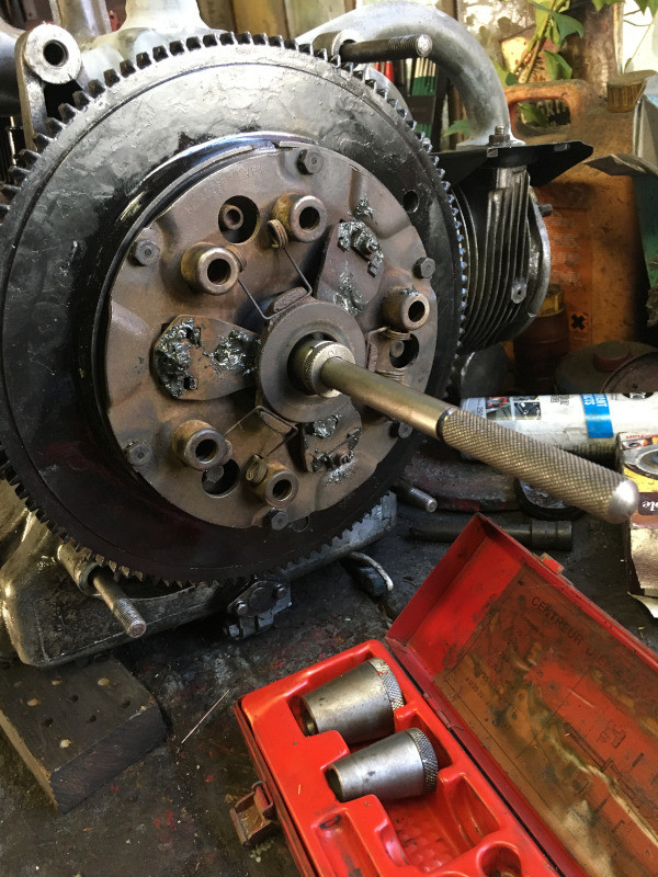 Je cite le fournisseur, au passage, "Rétro Design" qui a envoyé les bonnes pièces (la tôle de guidage portait une étiquette rédigée.. en néerlandais ;-)), à prix correct et avec des frais de port raisonnables (6,90 €) Ensuite, j'ai remonté le maître-cylindre neuf, après avoir lubrifié les articulations du pédalier, le câble d'embrayage et passé un coup de taraud dans les filetages en 7 mm du châssis... Enfin, j'ai extrait le roulement NADELLA (que j'avais abîmé lors au moment du dévissage difficile des vis du volant moteur) avec un extracteur à inertie, semblable à celui qu'utilise mon dentiste pour déposer mes couronnes dentaires