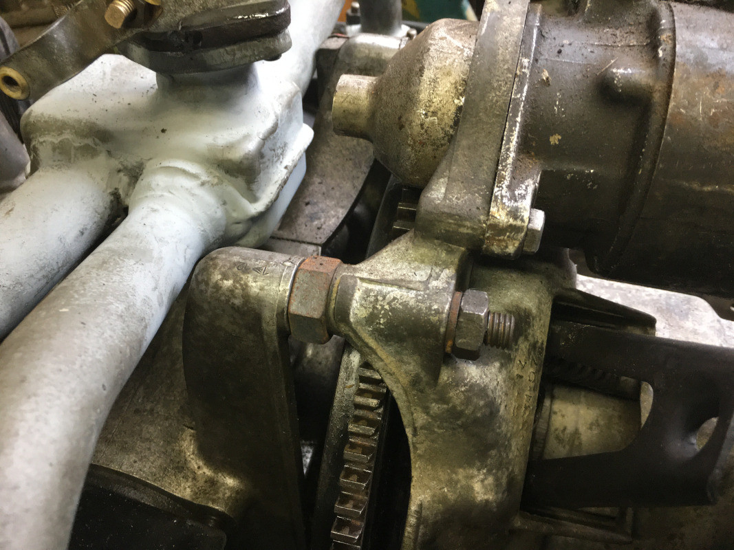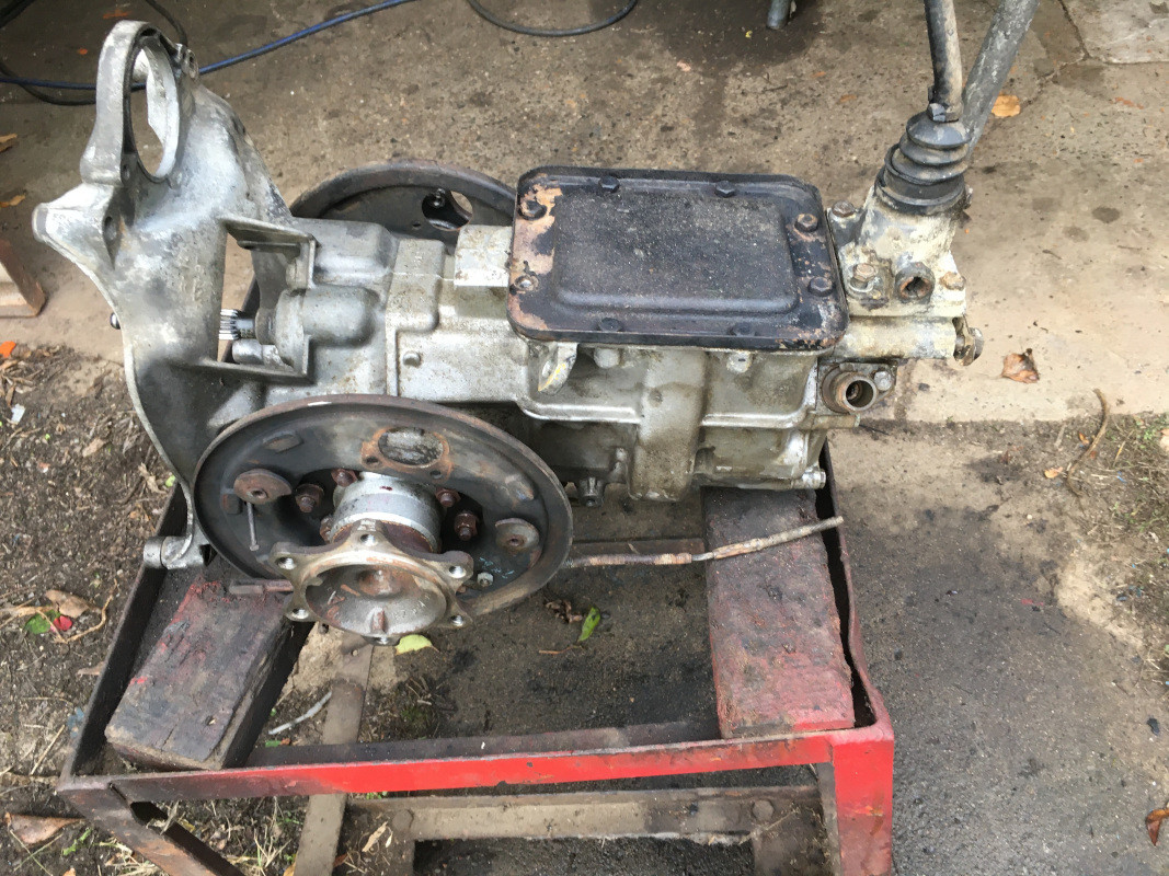 Ce matin, j'ai vidangé et nettoyé l'extérieur de la boite de vitesses. Elle contenait de l'huile (bien sale, mais il y en avait !) J'ai assemblé le moteur avec la boîte de vitesses "à blanc", pour pouvoir monter un démarreur et faire tourner le moteur pour contrôler la pression d'huile... Enfin, s'il n'y avait pas de (grosses) fuites, et l'huile montait aux culbuteurs..