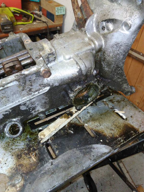:salut: cet après midi, je lui ai passée un coup de karcher, et je viens de déposer le cul de boite. Finalement, elle n'est pas trop mal au niveau de la pignonerie (pas abimée) et le carter est aussi encore en bel état (la graisse l'ayant conservée).