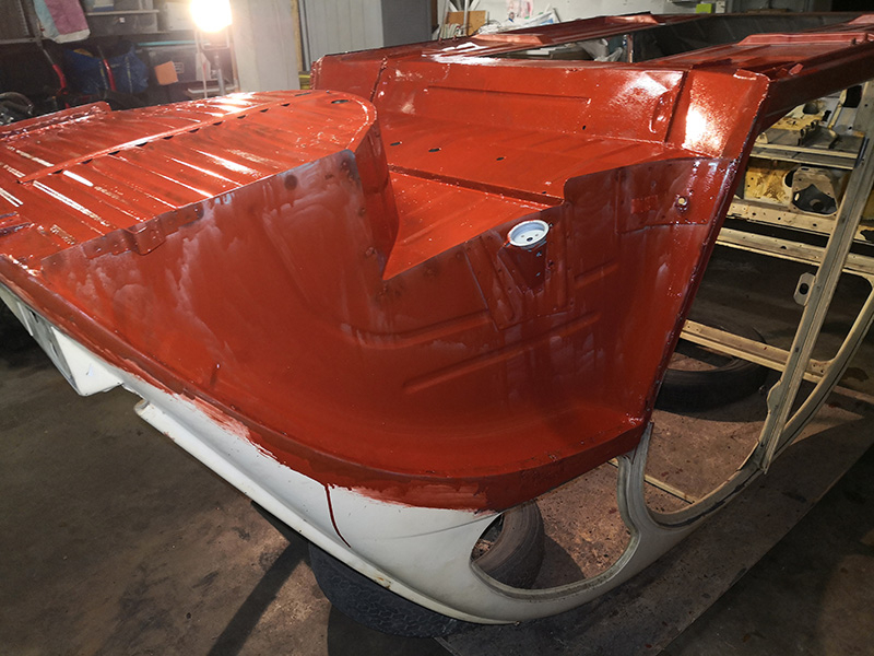 Application d'une peinture riche en zinc spéciale soudure afin de prévenir de la rouille. Et voilà, c'est soudé !!! J'avais remis la malle arrière temporairement pour faire les ajustements.