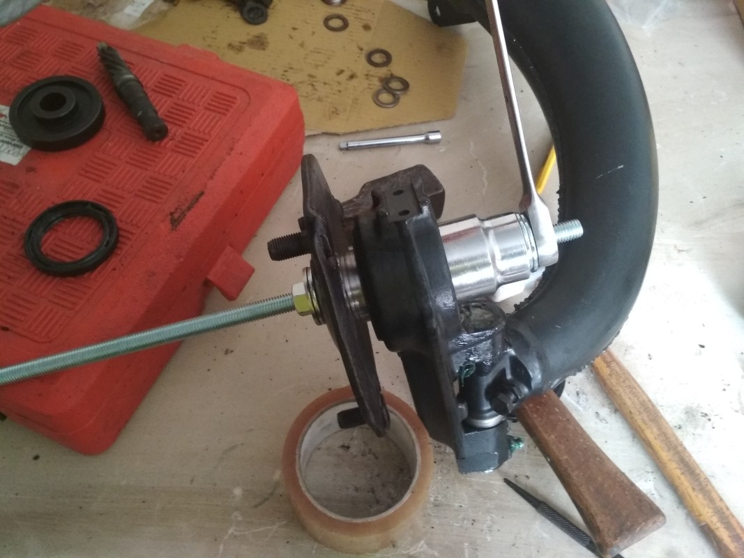 Remontage des roulements de roues et du pivot. (J'aurais du ne pas mettre le joint dans l'écrou du roulement avant d'avoir mis le flasque... encore une petite erreur)