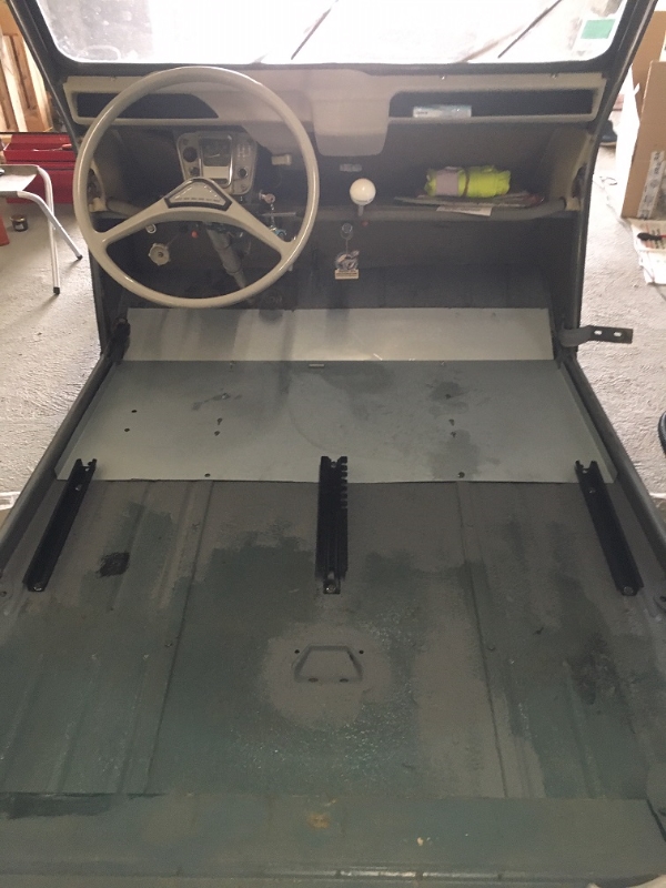 Je remplacerai l'année prochaine les deux planchers latéraux et la partie basse avant. En attendant, élimination des tôles pourries, traitement anti corrosion, peinture minium et noire et pose d'un plancher provisoir. Pour l'étanchéité extérieure, mastic et Blaxon.