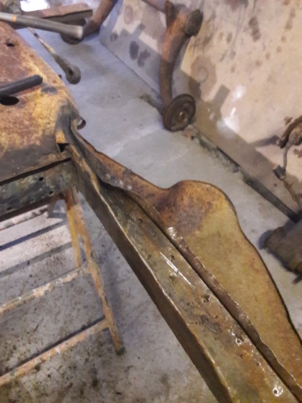 Je vous prie de bien vouloir excuser les "écarts" de langage d'hier. Vous aurez bien compris que je n'en veux absolument pas à mon vendeur, en fait, c'est à ma naïveté que j'en veux. Et comme me dit le soleil de ma vie "il faut arrêter de croire que les gens sont tous comme toi". Ce week-end, je vais pas faire grand-chose sur le châssis, j'ai des amis de 40 ans qui viennent. Le bras de châssis, je pense, a été redressé à l'arrache après le choc, le reste de la plate-forme semble correctement aligné sur les tréteaux qui, c'est vrai, ne sont pas un marbre. La tôle qui compose le bras est, comme vous pouvez le deviner sur les photos, toute chiffonnée. Je réfléchis à l'endroit où je vais couper pour redresser le plus facilement possible. Ensuite, je jouerai du TIG que va me prêter mon copain Yann. Faut que j'apprenne à souder avec cet appareil, je l'ai jamais fait.