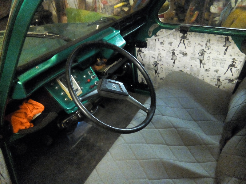 Et hop, un tableau de bord avec l'intérieur (housses Charleston, tissu spécifique choisi par Madame, moquette grise au sol, petit ruban de dentelle noire,...)