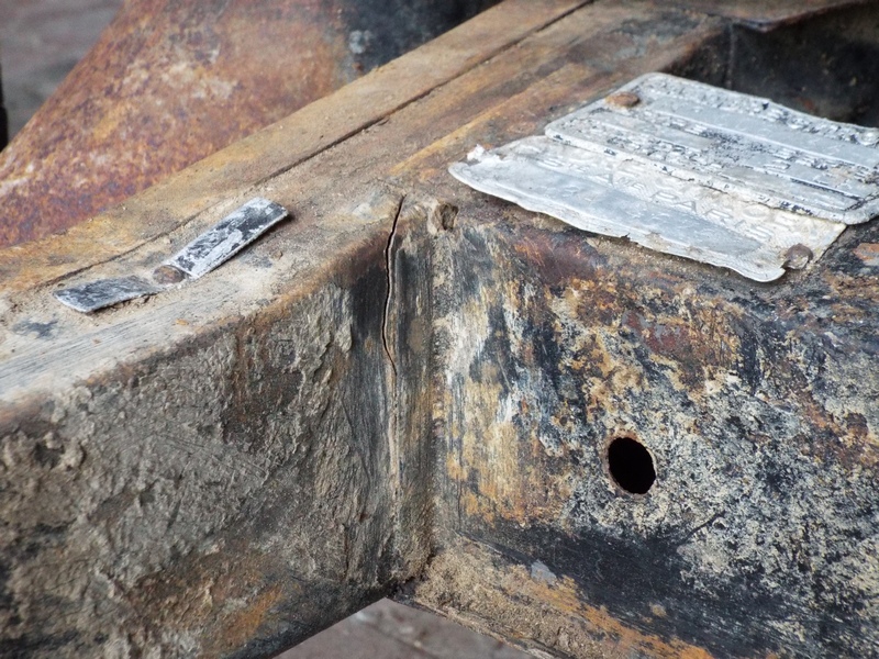 1 - le châssis a eu surement un gros choc à l'avant doit et a été réparé en soudant une grosse tôle en L qui fait la jonction entre le longeron et la traverse avant. C'est pas très beau au point de vue esthétique, mais ça a l'ai solide.