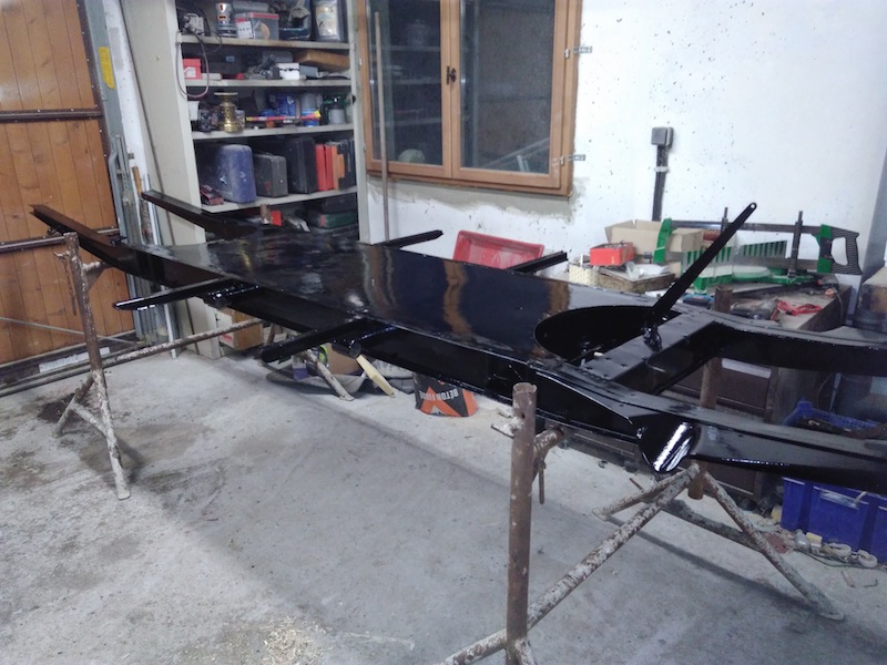 ensuite côté châssis, passage de l'antirouille au pinceau sur tous les éléments (châssis, essieux, batteurs,...) puis après séchage, passage d'une couche de noir + antirouille uniquement sur le châssis. Prochaine étape: couche finale noire antirouille sur le châssis et tous les éléments (essieux,...), puis antigravillon sur tôle inférieure châssis: