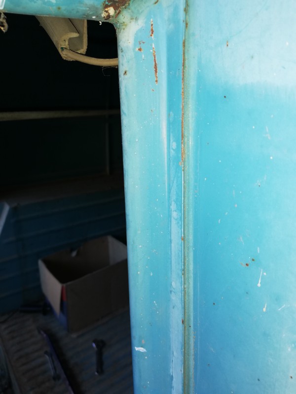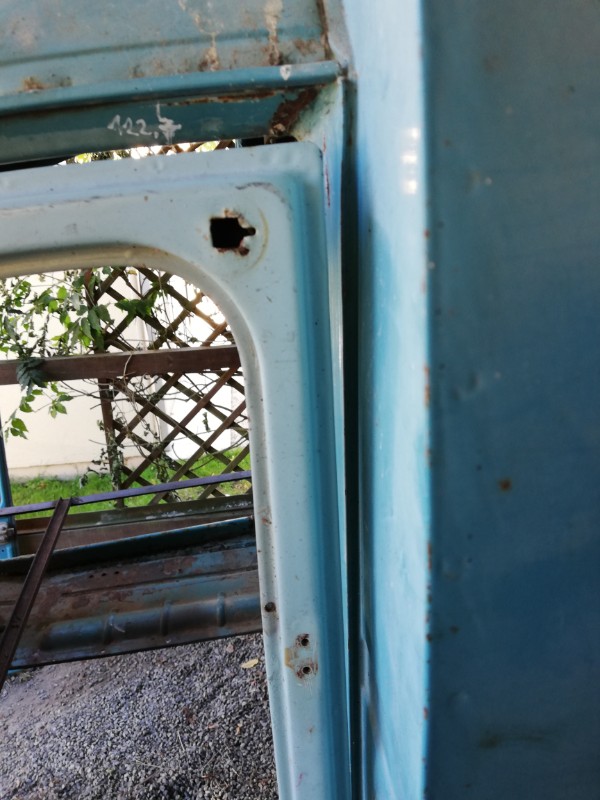 Je n'ai pas pensé à prendre des photos de la pose du vérin et de son action, j'étais vraiment trop concentré sur mon travail ...Je suis arrivé à redresser cet encadrement de portière en plaçant le vérin hydraulique en travers de la portière, le bas prenant appui sur un morceau de chevron taillé en V placé contre l'arrière de la caisse et le haut du vérin prenant appui juste à la courbure de l'encadrement ( un peu en dessous de la ligne bleue peinte sur la portière) car c'est là et à 20 cms de part et d'autre ce cette courbure que l'enfoncement du cadre s'est fait :