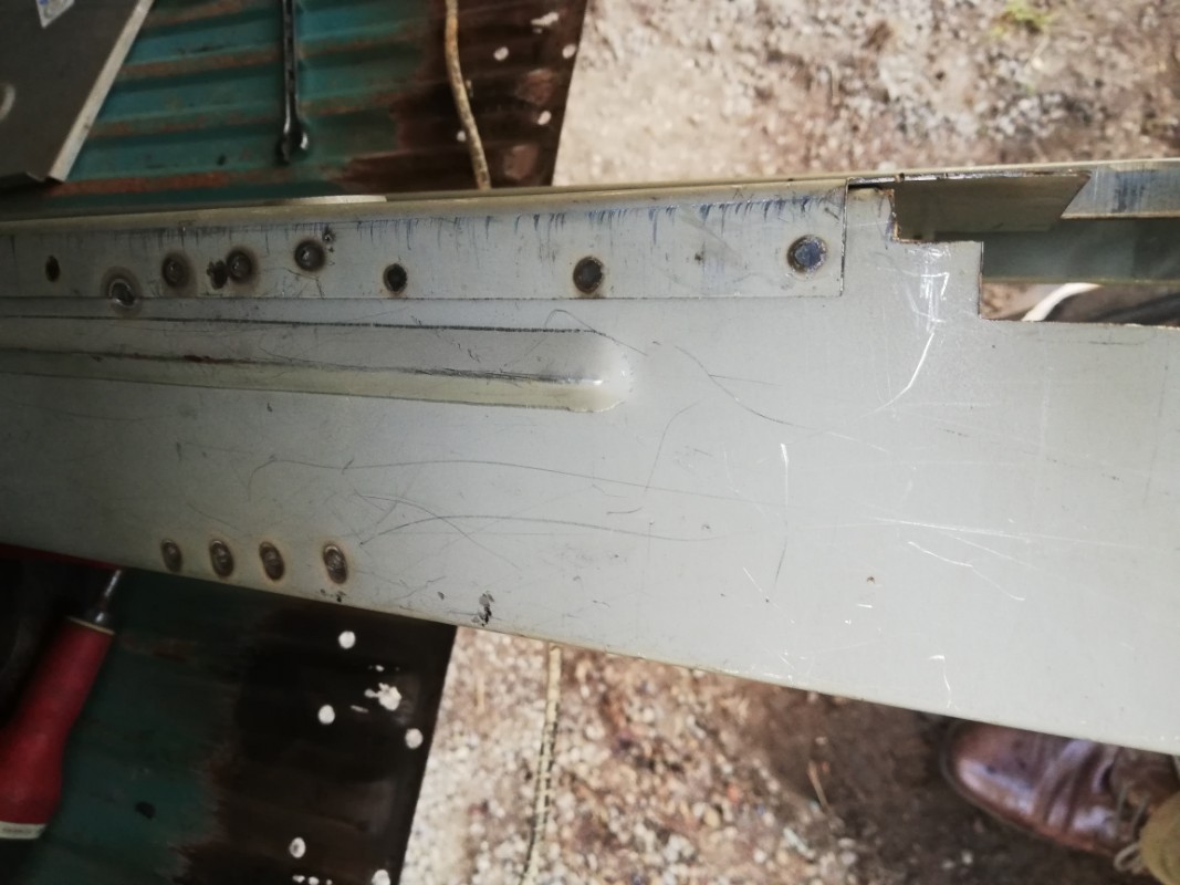 Voyez vous même : le bossage de l'ancienne jupe est très fin et à 1,5 cm du bord, celui de la neuve est bien plus large à 2,5 cms du bord : du coup le plancher se retrouve carrément sur le bossage et c'est pas top ! Sur l'ancienne jupe, la limite peinture/rouille correspond à l'emplacement du plancher ; on voit bien une différence de positionnement...
