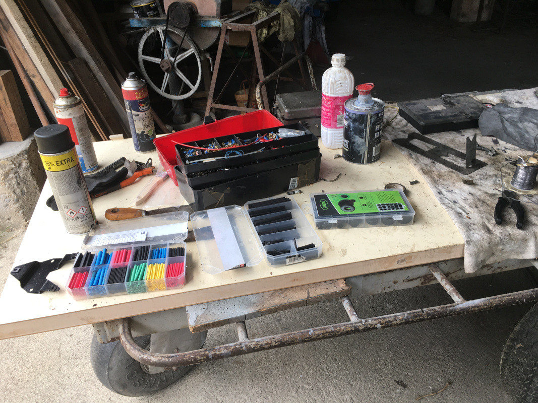 Voici les outils nécessaires en place (cosses, embouts de finition, gaines...), pince à sertir et fer à souder.