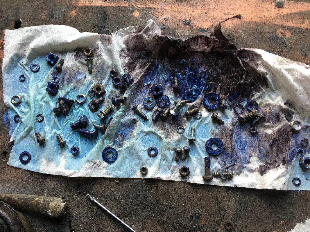 J'ai donc ressorti de mes vieilleries ce convertisseur, d'une puissance de 25A : Au passage, pensez-vous qu'il y ait une astuce pour améliorer la transparence des cabochons de clignotants, qui sont en assez bon état, pas cassés ni fendus, mais ternes : Ensuite, j'ai monté les pédales, chacune avec son ressort.. Je me suis aperçu qu'il manquait l'attache fixe du ressort, côté plancher des pédales : J'ai donc découpé les attaches d'origine afin de les river (je ne peux pas les souder par manque de place) : J'ai ensuite démonté l'avertisseur, qui est en parfait état, afin de le peindre correctement : Bonne après-midi à tous, restez à l'ombre !