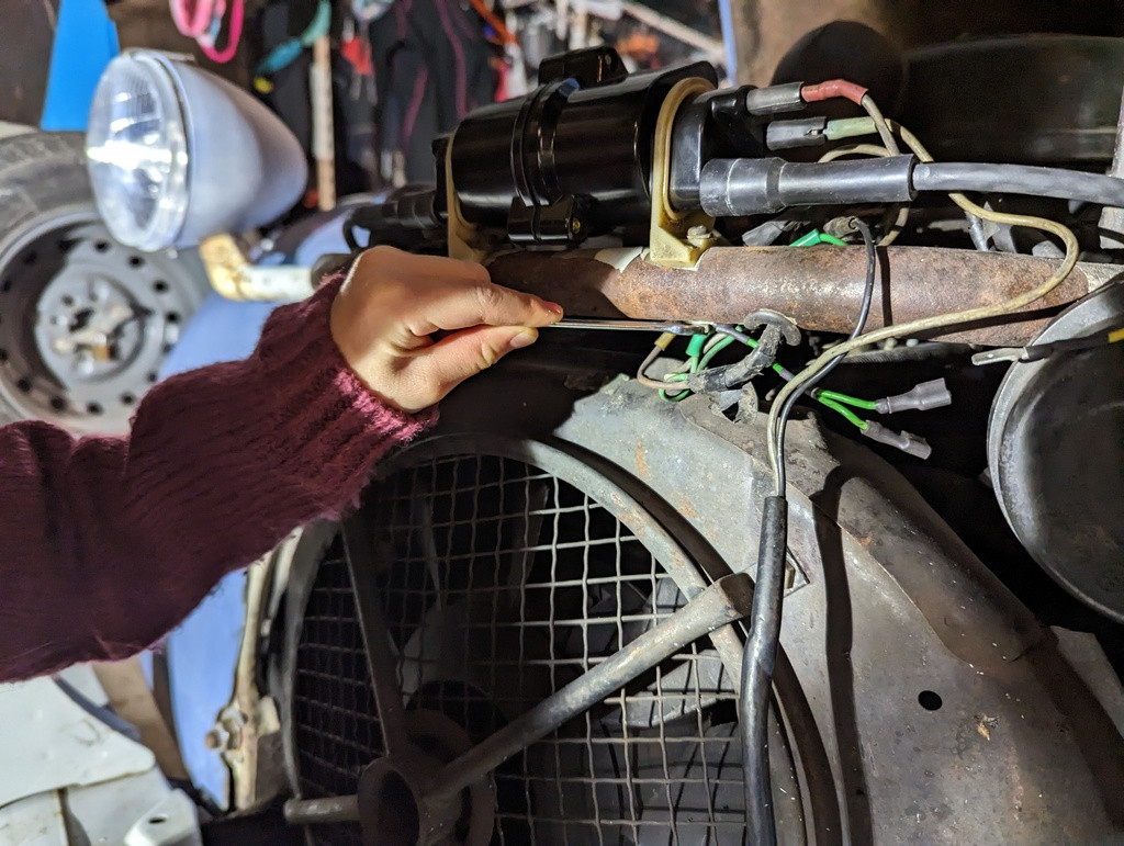 Là intervient ma princesse assistante pour fixer le piquage de la masse proprement sous une des vis qui tient le support de la bobine d'allumage.