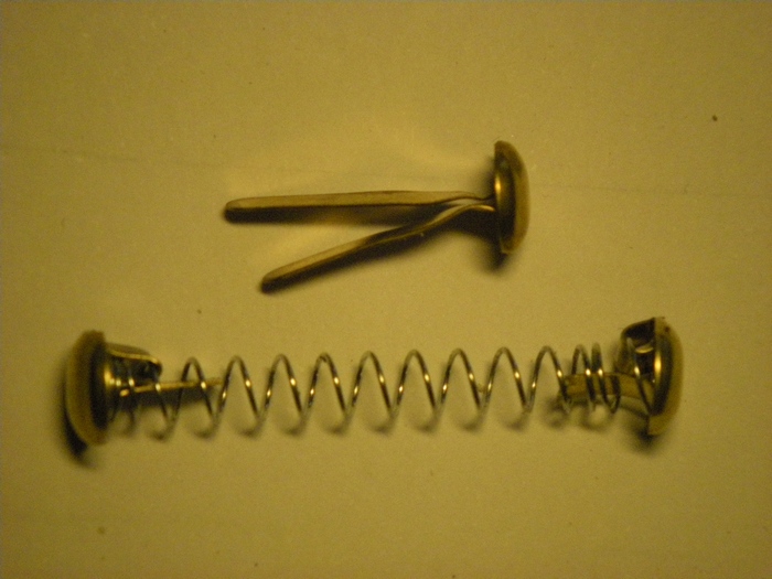 Sur ma bobine, il manque d'un coté un de ces fameux ressorts. Dans un premier temps j'en ai donc fabriqué un, avec un ressort de stylo bille et deux attaches parisiennes.