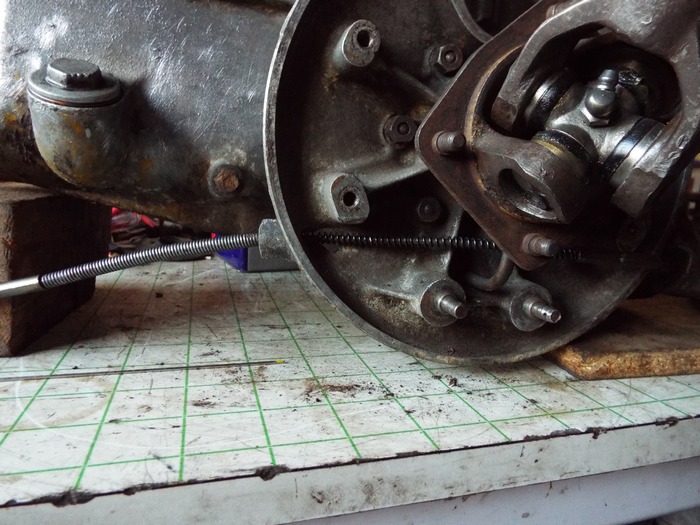 L'ensemble monté sur l'établi. Vue coté intérieur avec le levier de frein à main, on voit qu'il y a un ressort aussi de ce coté.