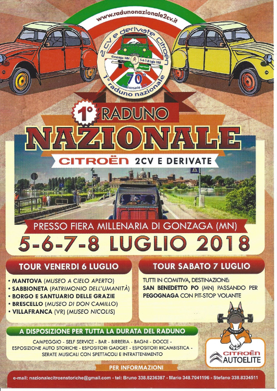 Plus particulièrement pour les gens du sud-est, la première Nationale Italienne de 2 CV et dérivés aura lieu du 5 au 8 juillet 2018 à Gonzaga, province de Mantua en Lombardie, à 140 km au sud-est de Milan et à 25 km au sud de Mantua.