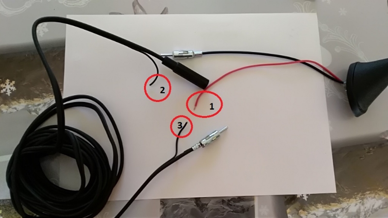 car il y a un fil rouge qui part du support d'antenne, que j'ai indiqué dans un rond rouge sur la photo ( N°1 ), je pense qu"il faut le brancher au fil noir (N°2) qui est avec le gros fil d'antenne , et ensuite relier le bout du fil N°3 a l'autoradio ?