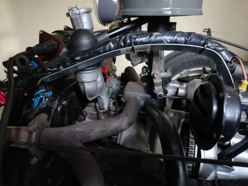 Oui cette pièce fixée à l'écrou du klaxon et venant sous la barre des phares est une fabrication maison toute simple qui me permet d'une part de maintenir la goulotte des fils électriques (phares-allumage -condo etc...) et surtout d'éviter qu'elle ne chauffe trop à cause de l'araignée en dessous, je la trouvais trop prêt de la tubulure sans compter que cette goulotte me gênait un peu aussi pour l'accès à la vis de richesse du carburateur.