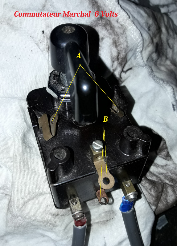 J'ai remis un commutateur de clignotants Marchal en parfait état en place sur la Panama , et refait une petite partie de la filerie qui a sérieusement vieillie :( , il y a apparemment deux emplacements qui ressembles à des portes fusible , sur l'ancien Marchal en place ( même modèle point de fusible ) d’où ma question ou je mets le fusible en position A ou B et quel tension de fusible .